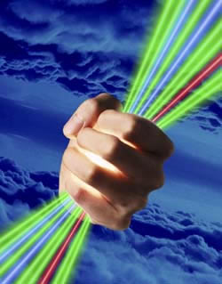 光を握る手は撮影の段階で処理し、飛びだす光はコンピュータで処理して、背景の空に合成してあります。撮影も当社で行いましたが、撮影と合成作業が一体となっているという事は、作業工程上たいへん効率的で、制作コストの上に有利です。